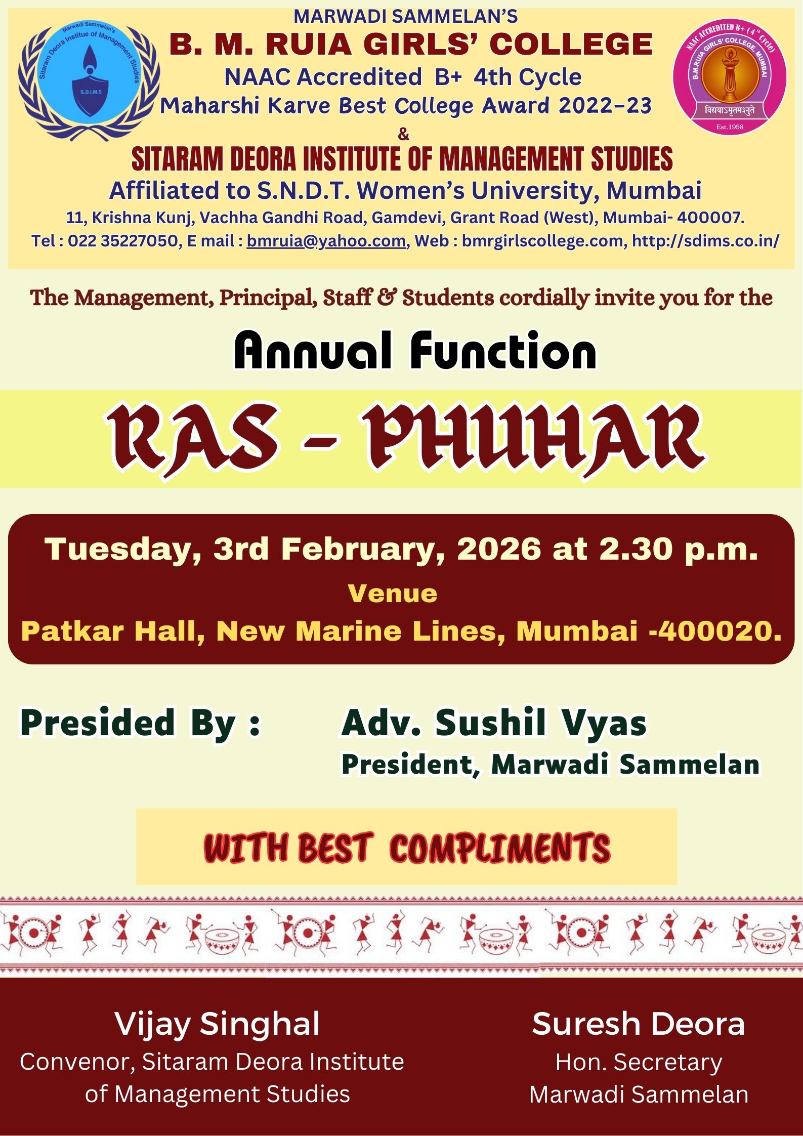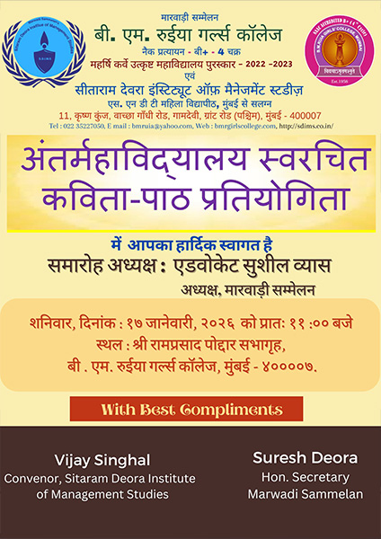 B. M. Ruia Girls College was established in 1958, then known as Hindi Medium College by Marwadi Sammelan, which was always in the forefront of propagating and promulgating Hindi. Impressed by the proficiency and dedication of the Sammelan, Smt. Nathibai DamodarThackersey Women’s University granted affiliation to the college in 1960. In 1963 the college received a generous donation of Rs. 75,000 from Smt. Bhagirathibai Manmal Ruia Trust, as a reciprocating gesture to this goodwill the college was named after the founder of the trust as Smt. Bhagirathibai Manmal Ruia College. For almost 10 years this college operated from Vidya Bhawan, Sitaram Poddar Marg, Mumbai.With the growing popularity the strength of students also multiplied. The limited space available at Vidya Bhawan was restricting the sky high aspirations of the faculty and students. In the year 1968 the college was shifted to the present location, Krishna Kunj, Vachha Gandhi Road, Mumbai -7 and the small building of the college soon grew five storeys tall. To cater to the diverse academic needs of the students, the college started Higher Secondary classes for Arts and Commerce, ie. Junior classes along with the Degree Courses.